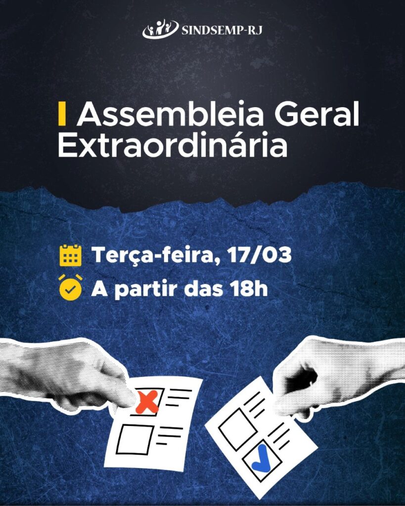 O Presidente do SINDSEMP-RJ, no uso de suas atribuições estatutárias, CONVOCA os filiados para Assembleia Geral Extraordinária, a realizar-se, de forma virtual, por meio da plataforma Zoom, no próximo dia 17 de março de 2026, às 17h30min em primeira convocação e, às 18h , em segunda e última chamada, com qualquer número de sindicalizados que estejam em dia com suas obrigações pecuniárias e no pleno exercício de seus direitos, para deliberar sobre a seguinte ordem do dia: